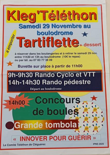 - Tartiflette et dessert (10€) à emporter entre 11h30 et 13h au boulodrome (sur réservation dans les boulangeries ou par téléphone).